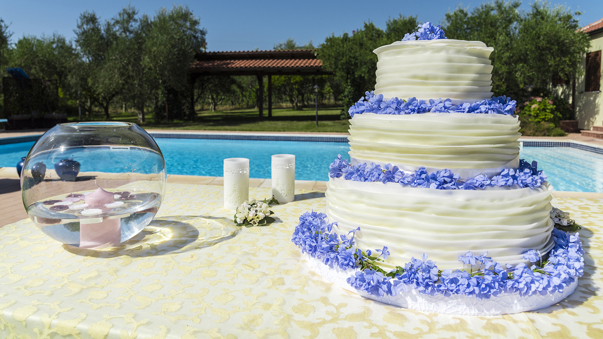 A bordo piscina, è possibile allestire il ricco aperitivo o cocktail serale ed il romantico taglio della torta.